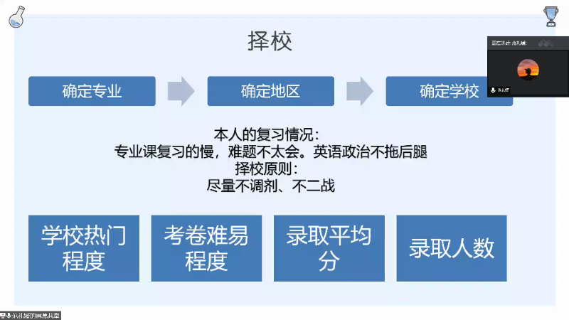 会议伊始,两位同学分别从如今的社会压力和梦想所在这两方面阐述了他们个人考研的原因。接着,他们为与会人员展示了考研学校的选择与各考研科目的时间安排表。其中,魏延同学首先就择校问题进行了详细的讲解,他总结自身考研经历给出三条建议:“第一要慎重的对待这个选择、第二除非成绩特别优秀不然就不要抱着调剂与二战去选择学校、第三要追寻自己的目标,不要被学校名头迷惑。”魏延同学还讲到专业课考试前要多次复习,并鼓励同学们备战考研期间规范作息,保证每天有效学习时间为9个小时。