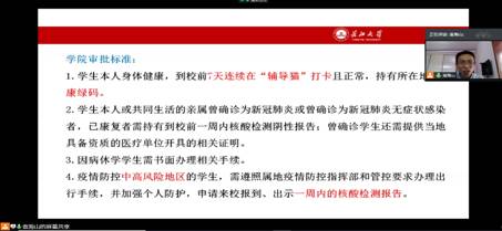 会议伊始,袁海山书记对2020级新生的到来表示欢迎及祝贺,接着袁书记从开学总体要求、报名时间及安排、迎接时间及地点、来校前的准备、新生进校流程这五大方面进行了详细讲解。他提醒员工们准备好医用口罩、体温计等防疫物资。袁书记传达学校指示:要求每位员工填写返校申请、到校前在今日校园“辅导猫”连续正常打卡7天且要持有健康码等内容,强调报到基本流程以及入校后的具体安排。在校期间有任何身体不适的情况需第一时间报告辅导员钟老师,确保每位新生身体健康。随后,在集中答疑环节,老师们就新生普遍关注的宿舍、缴纳学费、老员工医保和党团关系转接等方面的疑惑进行解答。会议最后,辅导员钟赛老师再次强调在返校前一定要自查体温,确保体温正常、尽量不乘坐私人大巴、确保自身安全、一定要在今日校园“辅导猫”连续打卡7天。
