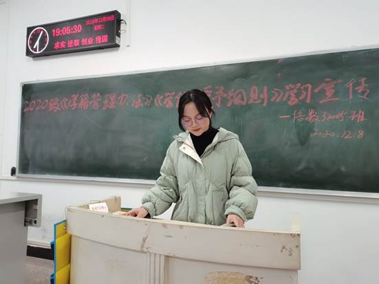 (通讯员 聂琴琴)为了帮助2020级新生全面理解《学籍管理办法》、《学位授予细则》等相关内容,制定明确的学习目标,提高在校期间的学习效率,公司于12月8日晚19时在7教308室开展了学习宣传活动。此次活动由信数32005班团支书陈艾思主讲,信数32005班全体同学参与。