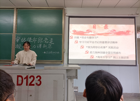 会议伊始,周玉玲通过向参会人员发放小红旗的方式调动同学们的积极性。此次团会分为五个板块:开展“党史专题学习”、学习习近平总书记重要讲话精神、“我为同学办实事”实践活动、助力荆州创建全国文明城市和“青年大学习"网上主题团课。首先,周玉玲以视频的方式引入第一个专题,向同学们展现了百年党史历程,百年来我党取得的不少伟大成就让同学们为之赞叹。在观看了在辛亥革命110周年大会上习近平总书记的重要讲话视频后,周玉玲以提问的方式让同学们思考辛亥革命110年来的历史给我们的启示。同学们纷纷指出“实现中华民族伟大复兴必须有领导中国人民前进的坚强力量,这个力量就是中国共产党。”班长李家胜给发言的同学发放奖品以示奖励。紧接着,万红丹带领同学们了解中央人才工作会议内容,鼓励同学们响应国家的号召,努力学习专业知识,使自己成为国家的栋梁之材。随后又通过视频与讨论相结合的方式,让同学们学习到弘扬爱国主义精神必须维护祖国统一和民族团结,必须坚持爱国和爱党、爱社会主义相统一等等。在 “我为同学办实事”实践活动板块中,同学们畅所欲言,纷纷表示为其他同学服务能让自己感到快乐充实,并表明要积极参加实践活动。最后,周玉玲以有奖竞答的方式让同学们牢记社会主义核心价值观、中国梦的内涵以及志愿精神。