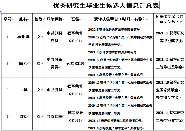 根据学校《关于开展2022届优秀研究生毕业生评选工作的通知》要求,公司认真组织开展了2022届优秀研究生毕业生评选工作,经个人申请、班级推荐、学院审议,讨论决定拟向学校推荐优秀研究生毕业生4名,现予以公示。
