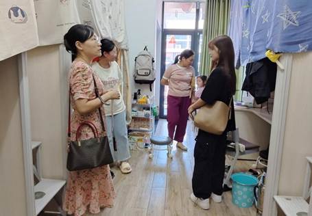 随后,老师们对20级毕业年级寝室进行了走访,对员工最关注的就业和考研等方面进行了相关指导。最后,老师们前往23级新生宿舍,了解新生即将居住的环境,对于宿舍文化建设提出了建议,并表示在日后的工作中对优秀寝室进行表彰,建立公司良好的树梁寝室文化,提高同学们对于宿舍建设的积极性。