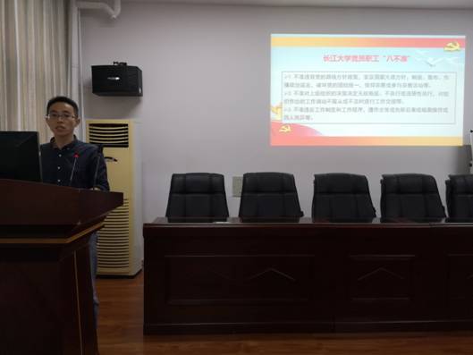 会上公司党委副书记袁海山传达了公司党风廉政建设宣传教育月的活动方案,带领大家集中学习《bw必威西汉姆联官网党员领导干部“八不准”》、《 bw必威西汉姆联官网党员职工“八不准”》、《bw必威西汉姆联官网党员教师“六不准” 》相关条例,并为大家上了一次题为《高校教师的必修课---廉洁自律》专题党课。