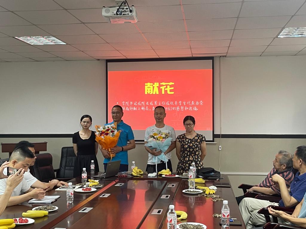 接近尾声,两名青年教师代表给两位荣休教师献花,最后全体参会人员合影留念。
