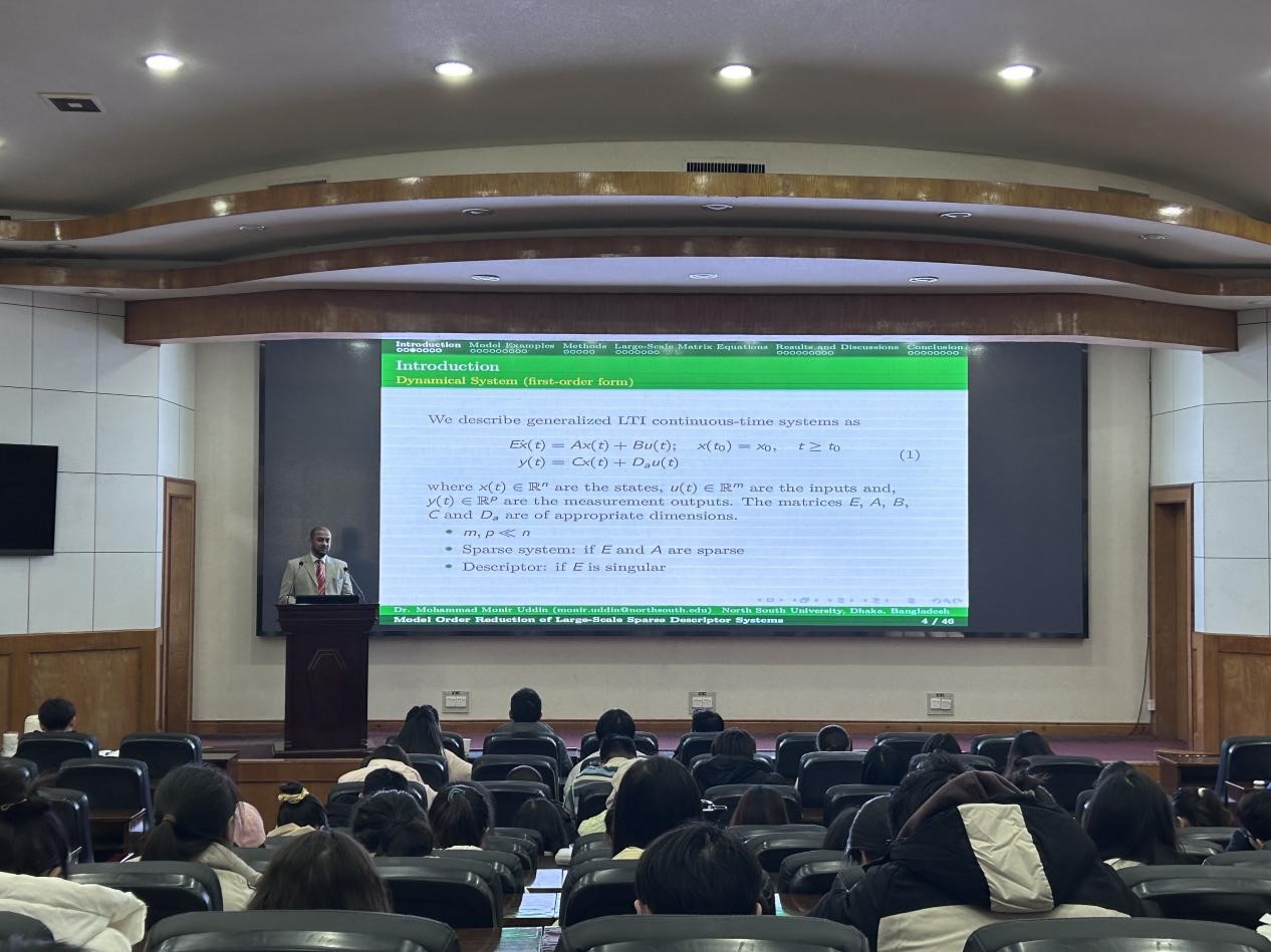 2023年12月25日,孟加拉国南北大学数学和物理系教授Mohammad Monir Uddin应邀访问公司,在11教学术报告厅为学院师生作了题为“Model Order Reduction of Large- Scale Sparse Descriptor Systems(大规模稀疏描述系统的模型降阶)”的学术报告,报告由经理张涛主持。bw必威西汉姆联官网的青年教师、研究生和本科生参加了本次学术报告会。