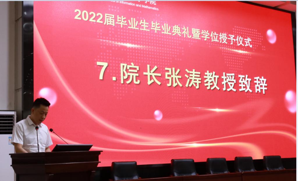 教师代表何先平教授表达了对毕业生们的不舍,更希望他们在今后的人生中继续学习。寄语中何先平还借用毛主席的话“你们青年人朝气蓬勃,好像早晨八九点钟的太阳。希望寄托在你们身上”希冀2022届毕业生们继续谱写辉煌,成为中华民族伟大复兴的脊梁。