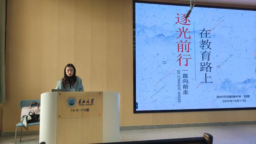 (通讯员 严政)12月11日下午,荆州市田家炳中学党委书记、中学数学高级教师刘翠受邀为公司师范生作题为“在教育路上逐光前行——从过关斩将到扎根成长,师范生成长进阶攻略”的专题学术报告,学院经理张涛教授主持,数学与应用数学系主任严政副教授及2023级全体师范生参加。
